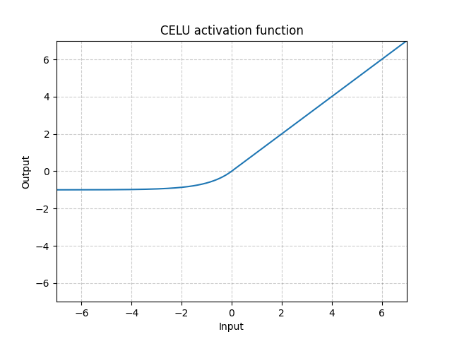 \[\text{CELU}(x) = \max(0, x) + \min(0, \alpha * (\exp(x/\alpha) - 1)\]
